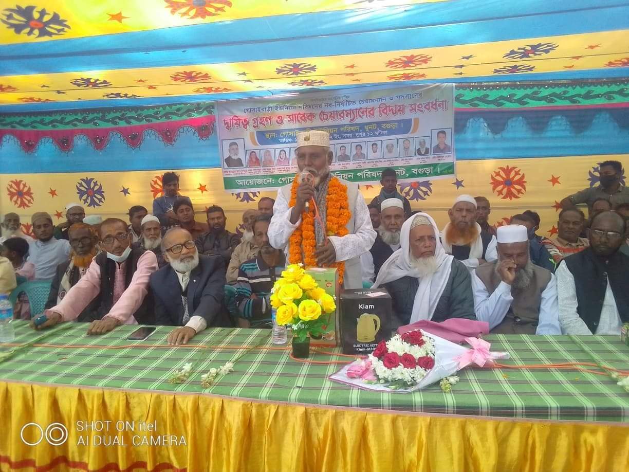 বগুড়ার ধুনট উপজেলার গোসাইবাড়ি ইউনিয়ন পরিষদ আয়োজিত গোসাইবাড়ী ইউনিয়ন পরিষদের নবনির্বাচিত চেয়ারম্যান ও সদস্যদের দায়িত্ব গ্রহণ ও সাবেক চেয়ারম্যানের বিদায় সংবর্ধনা অনুষ্ঠান অনুষ্ঠিত হয়েছে আজ রবিবার দুপুরে গোসাইবাড়ী ইউনিয়ন পরিষদ মিলনায়তনে। গোসাইবাড়ী ইউনিয়ন পরিষদের সাবেক চেয়ারম্যান মইনুল হাসান মুকুলের সভাপতিত্বে দায়িত্ব গ্রহণ ও বিদায় সংবর্ধনা অনুষ্ঠানে বক্তব্য রাখেন গোসাইবাড়ী ইউনিয়ন পরিষদের নবনির্বাচিত চেয়ারম্যান মাসুদুল হক বাচ্চু। তিনি বলেন, গোসাইবাড়ী ইউনিয়নকে আমি মডেল ইউনিয়ন পরিষদ হিসেবে তৈরি করতে চাই। গোসাইবাড়ি ইউনিয়ন একটি ডিজিটাল শহর হিসাবে গড়ে তুলবো এখানে থাকবে না কোন ভেদাভেদ থাকবে না কোন অন্যায় অপরাধ একটি সুন্দর সুস্থ সমাজ প্রতিষ্ঠায় তিনি ঐক্যবদ্ধ।