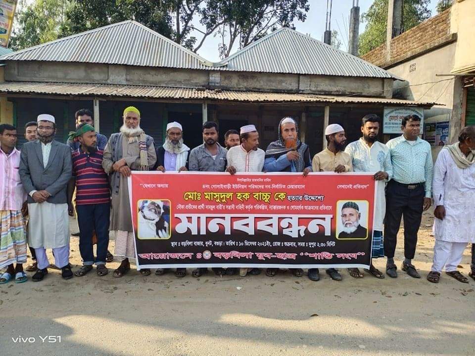 উপজেলার ৪নং গোসাইবাড়ী ইউনিয়ন পরিষদের নবনির্বাচিত চেয়ারম্যান মোঃ মাসুদুল হক বাচ্চুর উপর অতর্কিত হামলার প্রতিবাদে ও হামলাকারীদের দ্রুত শাস্তির দাবি এবং অতি শীগ্রই তাদেরকে আইনের আওতায় এনে শাস্তি দেওয়ার লক্ষ্যে জন্য প্রশাসনের সুদৃষ্টি কামনা করে আজ শুক্রবার (১০ ডিসেম্বর ) দুপুর ২ টার সময় বড়বিলা বাজারে সামাজিক সংগঠন বড়বিলা যুব ছাত্র "শান্তি সংঘ " মানববন্ধন করেন। মানববন্ধনে বক্তব্য রাখেন, মাওলানা ইসমাইল হোসেন জিহাদী,তোজাম প্রাং, মাওলানা শিব্বির, আব্দুল কাফি কাজী, সোলাইমান আকন্দ, সৈকত,বাবুল, কাউসার,ওবায়দুল,সোহাগ, আপেল,শাহেদ, আবু তালেব, সুমন সহ প্রমুখ