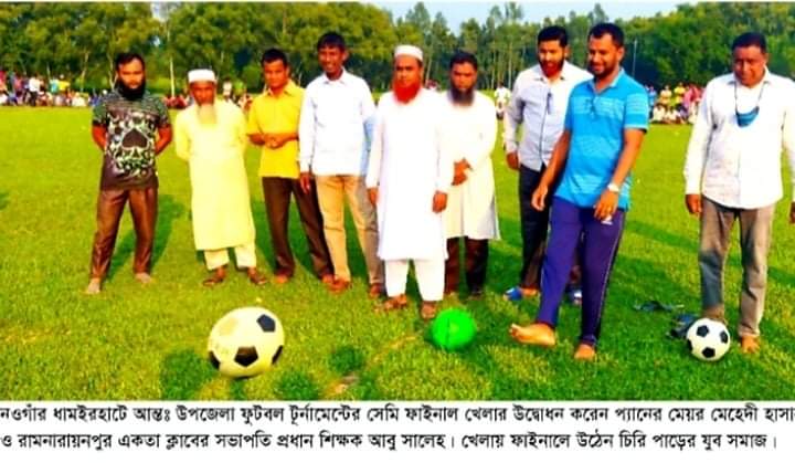 নওগাঁর ধামইরহাটে আন্তঃউপজেলা ফুটবল টূর্নামেন্টের সেমিফাইনাল খেলার উদ্বোধন করা হয়েছে। রামনারায়নপুর একতা ক্লাবের উদ্যোগে ২৫ অক্টোবর বিকেল ৪ টায় রামনারায়নপুর ফুটবল মাঠে খেলার উদ্বোধন করেন একতা ক্লাবের সভাপতি আবু সালেহ এবং পৌরসভার প্যানেল মেয়র মেহেদী হাসান। এ খেলায় প্রতিযোগিতা করেন ধামইরহাট পৌরসভা বনাম চিরিপাড়ের যুব সমাজ একাদ্বশ। ট্রাইবেকারে ৪-৫ গোলে চিরিপাড়ের যুব সমাজ একাদ্বশ ফাইনালে যান। ফাইনাল খেলায় সাহাপার বরেন্দ্র ক্লাবের সাথে চুড়ান্ত প্রতিযোগিতায় লড়বেন চিড়িপাড়ের যুব সমাজ ফুটবল টিম। ধামইরহাট পৌরসভার প্যানেল মেয়র মুক্তাদিরুল হক মুক্তা, পত্নীতলা উপজেলার পাটিচরা ইউপি চেয়ারম্যান রায়হানুল আলম, ধামইরহাট উপজেলা ক্রীড়া সংস্থার সম্পাদক ও সরকারি এম এম ডিগ্রী কলেজের প্রভাষক মিনহাজুল হক সরকার শিবলী, উপজেলা ফুটবল ফেডারেশনের সভাপতি নাসির মাহমুদ প্রমুখ খেলা উপভোগ করেন। চিরিপাড়ের যুব সমাজ সংগঠনের সভাপতি মো. আবাবিল জানান, তরুন সমাজকে মাদক থেকে দুরে রাখতে আমাদের এই প্রয়াশ, আশা করি চুড়ান্ত বিজয় আমরা অর্জন করতে পারবো।উল্লেখ্য গত ২০ সেপ্টেম্বর বিকেল ৫ টায় এ খেলার উদ্বোধন করেন উপজেলা চেয়ারম্যান আজাহার আলী মন্ডল ও উপজেলা নির্বাহী অফিসার গনপতি রায়।
