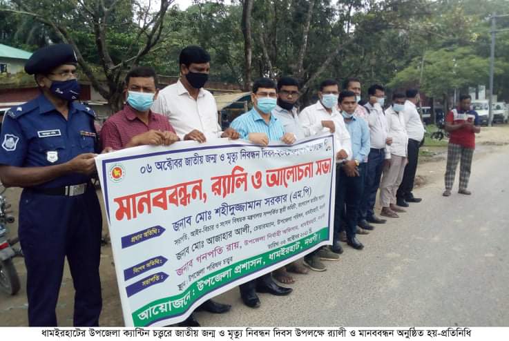 নওগাঁর ধামইরহাটে জাতীয় জন্ম ও মৃত্যু নিবন্ধন দিবস উদযাপন উপলক্ষে মানববন্ধন,র্যালী ও আলোচনা সভা অনুষ্ঠিত হয়েছে। বৃধবার বেলা ১১টায় উপজেলা প্রশাসনের আয়োজনে উপজেলা পরিষদ চত্ত¡র থেকে র্যালী বের করা হয়। র্যালী শেষে উপজেলা গেটের সামনে ধামইরহাট-নওগাঁ আঞ্চলিক মহাসড়কের পার্শে জনগণকে জন্ম ও মৃত্যু নিবন্ধন করতে এক সচেতনামূলক সভা অনুষ্ঠিত হয়। এতে প্রধান অতিথি হিসেবে উপস্থিত ছিলেন উপজেলা নির্বাহী অফিসার গনপতি রায়। দিবসটির এবারের প্রতিপাদ্য ছিল সবার জন্য প্রয়োজন জন্ম ও মৃত্যুর পরপরই নিবন্ধন।