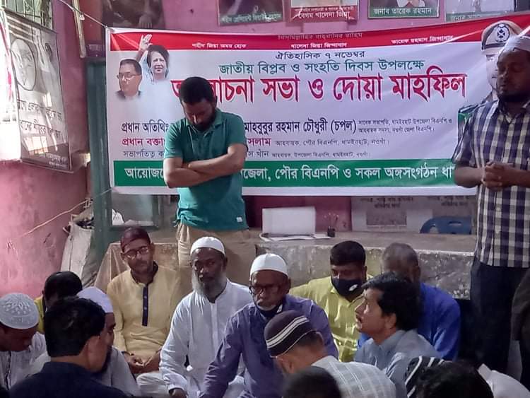 ৭ নভেম্বর রবিবার সকাল ১০ টায় দলীয় অফিসে জাতীয় ও দলীয় পতাকা উত্তোলন, বেলা ১১ টায় দলীয় কার্যালয়ে মিলাদ মাহফিল ও বিশেষ দোয়া শেষে উপজেলা বিএনপির আহবায়ক মোঃ ফেরদৌস খান এর সভাপতিত্বে এক আলোচনাসভা অনুষ্ঠিত হয়।