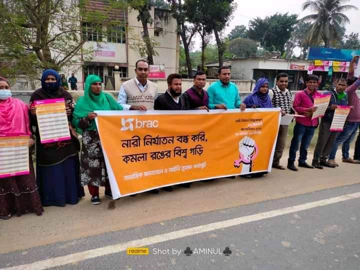 নওগাঁয় ব্র্যাক সামাজিক ক্ষমতায়ন ও আইনি সুরক্ষা কর্মসূচির আওতায় রবিবার বিকেল ৩ টায় নওগাঁ সদর অফিসের আয়োজনে নারী নির্যাতন নির্মূল করনের লক্ষে "নারী নির্যাতন বন্ধ করি কমলা রংয়ের বিশ্ব গড়ি" এই স্লোগান কে সামনে রেখে ১৬ দিনব্যাপী বিভিন্ন কর্মসসূচীর মধ্যে গত ২৫ শে নভেম্বর থেকে আগামী ১০শে ডিসেম্বর পর্যন্ত নারী নির্যাতন দমন উপলক্ষে নওগাঁ ব্র্যাক অফিসের সামনে নওগাঁ-রাজশাহী মহাসড়কে এক মানববন্ধন করা হয়। উক্ত মানববন্ধন অনুষ্ঠানে উপস্থিত ছিলেন নওগাঁ সদর ব্র্যাক দাবি এবং প্রগতির এরিয়া ম্যানেজার মোঃ আলমগীর হোসেন ও মোঃ সাফিরুল ইসলাম, দাবি,বিসিইউপি ম্যানেজারসহ আরো অন্যান্য ব্র্যাকের স্টাফ এবং নাট্যকর্মী বৃন্দ।আয়োজনে সার্বিক সহযোগিতা করেন নওগাঁ ব্র্যাক সামাজিক ক্ষমতায়ন ও আইনি সুরক্ষা কর্মসূচির অফিসার (সেলপ) মোঃ আমিনুল হক।