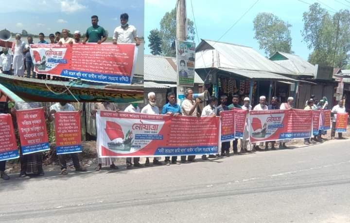 গত শুক্রবার (১০ সেপ্টেম্বর) দুপুর ১২টার দিকে উপজেলার ঝালুপড়া ব্রিজপাড় মোড়ে বাংলাদেশ কৃষক সমিতি ও ‘নদী ভাঙলে জমি খাস’ আইন বাতিল সংগ্রাম কমিটির যৌথ উদ্যোগে প্রায় ঘণ্টাব্যাপী মানববন্ধন পালিত হয়। পরে জামালপুরের সরিষাবাড়ী উপজেলা ও সিরাজগঞ্জের কাজিপুর উপজেলার নদী তীরবর্তী সর্বস্বহারা দুই শতাধিক মানুষ নৌকাযোগে যমুনা নদীপথে তিনদিনের নৌযাত্রা শুরু করেন।