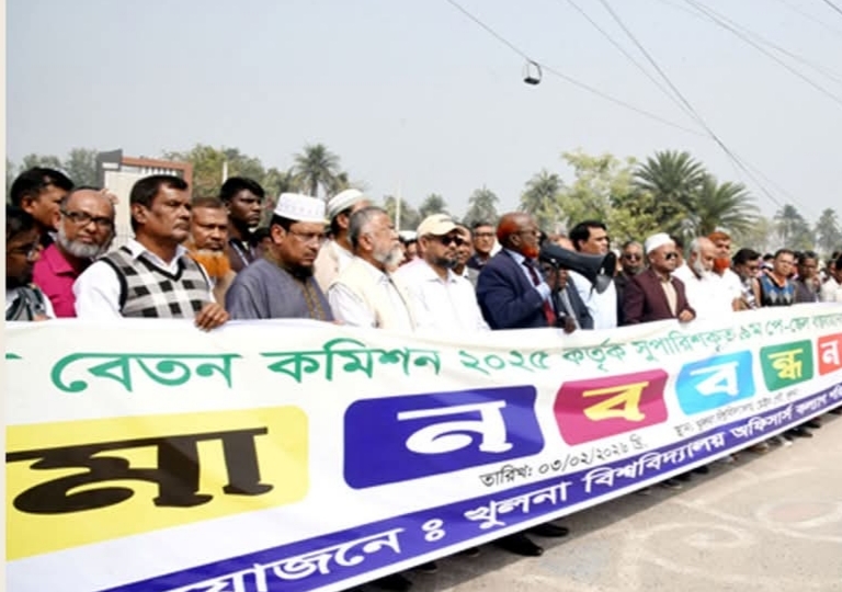 জাতীয় বেতন কমিশন-২০২৫ কর্তৃক সুপারিশকৃত ৯ম পে স্কেল বাস্তবায়নের দাবিতে মানববন্ধন কর্মসূচি পালন করেছে খুলনা বিশ্ববিদ্যালয় অফিসার্স কল্যাণ পরিষদ। আজ মঙ্গলবার (০৩ ফেব্রæয়ারি) দুপুর ১২টায় বিশ্ববিদ্যালয়ের মেইন গেটের সামনে এ মানববন্ধন কর্মসূচি পালিত হয়। মানববন্ধনে সভাপতিত্ব করেন অফিসার্স কল্যাণ পরিষদের সাধারণ সম্পাদক এস এম মোহাম্মদ আলী।