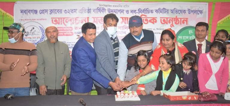 মোঃ মামুনুর রশিদ, নবাবগঞ্জ,(দিনাজপুর)প্রতিনিধিঃদিনাজপুরের নবাবগঞ্জে নানা আয়োজনের মধ্যদিয়ে নবাবগঞ্জ প্রেসক্লাবের ৩২তম প্রতিষ্ঠা বার্ষিকী ও নবনির্বাচিত কমিটির অভিষেক অনুষ্ঠিত হয়েছে। রবিবার বিকাল ৩টায় উপজেলার শেখ রাসেল জাতীয় উদ্যানে (আশুড়ার বিল) প্রতিষ্ঠাবার্ষিকী ও নবনির্বাচিত কমিটির অভিষেক উপলক্ষে নবাবগঞ্জ প্রেসক্লাবের সভাপতি মো. হাসিম উদ্দিনের সভাপতিত্বে আলোচনা সভা ও সাংস্কৃতি অনুষ্ঠান অনুষ্ঠিত হয় । আলোচনা সভায় শুভেচ্ছা বক্তব্য রাখেন প্রেসক্লাবের সভাপতি মো. হাসিম উদ্দিন, আমন্ত্রিত অতিথি উপজেলা নির্বাহী অফিসার অনিমেষ সোম,উপজেলা পরিষদের ভাইস চেয়ারম্যান মো. আব্দুর রাজ্জাক ও মহিলা ভাইস চেয়ারম্যান মোছা.পারুল বেগম। আলোচনা সভা শেষে অতিথিরা প্রতিষ্ঠা বার্ষিকীর কেক কাটেন। পরে প্রেসক্লাবের সৌজন্যে অনুষ্ঠানের আমন্ত্রিত অতিথি,উপজেলার ৯টি ইউনিয়নের নবনির্বাচিত চেয়াম্যানগণ ও প্রসক্লাবের নবনির্বাচিত কমিটিকে বিশেষ সম্মাননা স্মারক প্রদান করা হয় ।