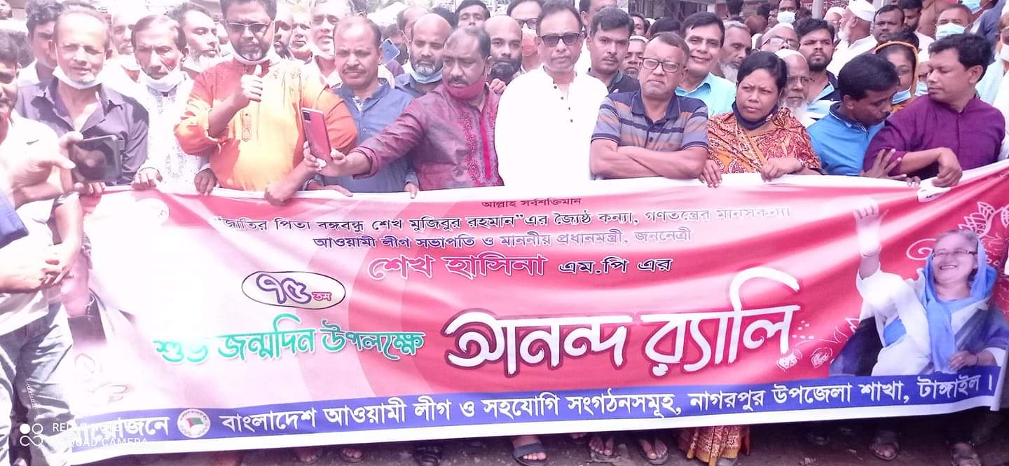 কন্যা গণপ্রজাতন্ত্রী বাংলাদেশ সরকারের মাননীয় প্রধান মন্ত্রী শেখ হাসিনার ৭৫তম জন্মদিন উপলক্ষে টাংগাইলের নাগরপুরে আনন্দ র্যালি, আলোচনা সভা, কেক কাটা ও দোয়া মাহফিল অনুষ্ঠিত হয়েছে।