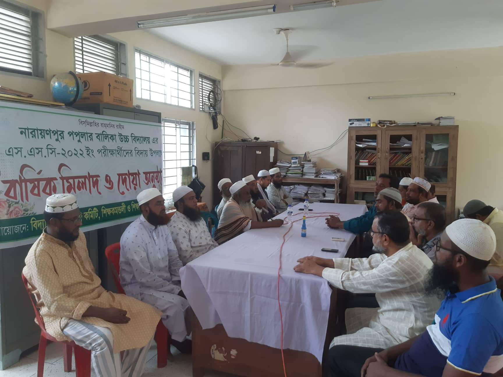 চাঁদপুরের মতলব দক্ষিণ উপজেলার ঐতিহ্যবাহী নারায়ণপুর পপুলার বালিকা উচ্চ বিদ্যালয়ে ২০২২ সালের এসএসসি পরীক্ষার্থীদের বিদায় উপলক্ষে আলোচনা সভা, মিলাদ ও দোয়া অনুষ্ঠান অনুষ্ঠিত হয়েছে।