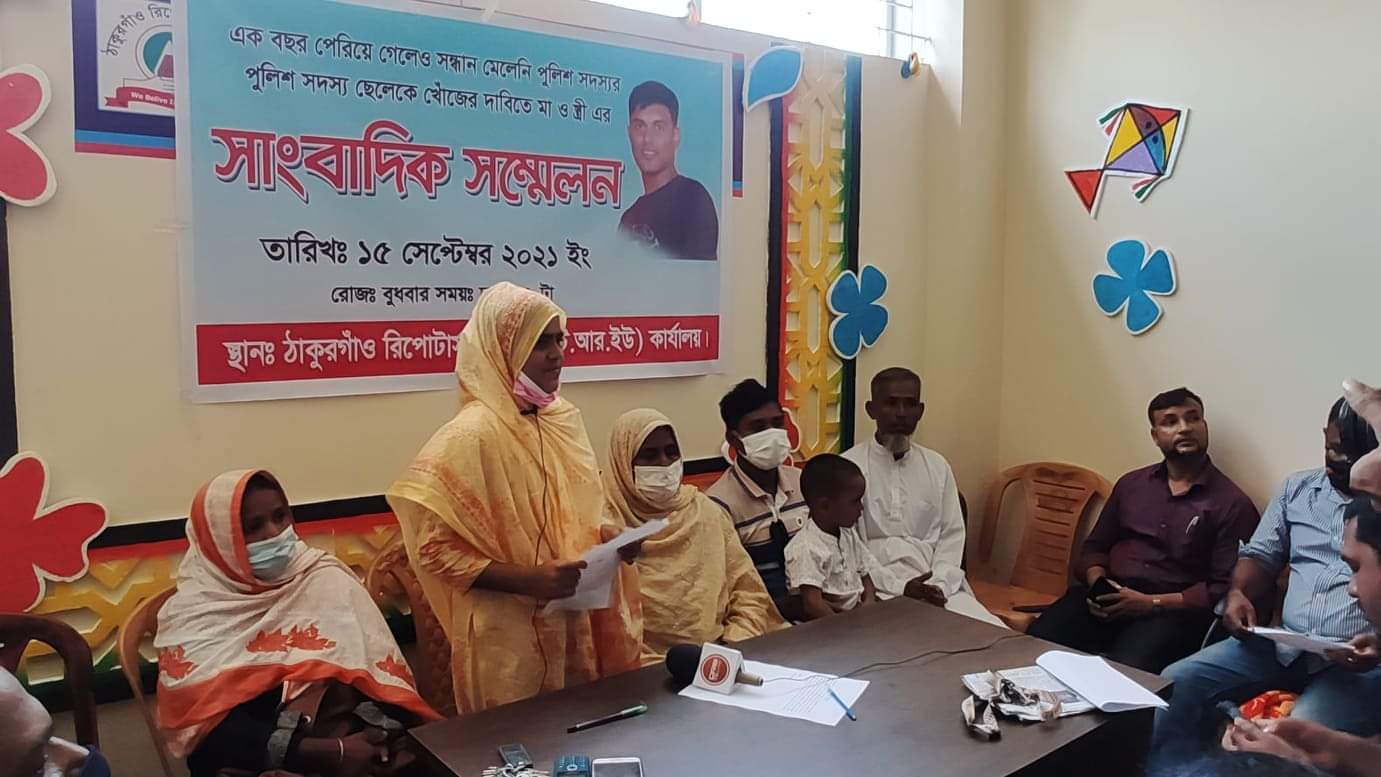 সাংবাদিক সম্মেলনে তাঁর মা মনোয়ারা বেগম লিখিত বক্তব্যে বলেন, গত বছরের ২৮ আগস্ট তাকে বাড়ীতে আসার জন্য ছুটি দিলে পুলিশ লাইন থেকে বের নিখোঁজ হয় ওই পুলিশ কনস্টেবল। এরপর থেকে সকল স্থানে খোঁজাখুজি সন্ধান পায়নি তাঁর পরিবার। সন্ধান চেয়ে পঞ্চগড় থানায় সাধারণ ডাইরী করার এক বছর সময় পার হয়েছে। পঞ্চগড়ের পুলিশ সুপার, অতিরিক্ত পুলিশ সুপার, নীলফামারী জেলার গোয়েন্দা বিভাগের হাশিবুল ইসলামসহ উর্দ্ধতন কর্তৃপক্ষের নিকট একাধিকার আমার ছেলের সন্ধাননে গেলেও তাঁরা কোন সহযোগিতা করেনি। উল্টো আজ কাল আসবে বলে কালক্ষেপন করছেন।
