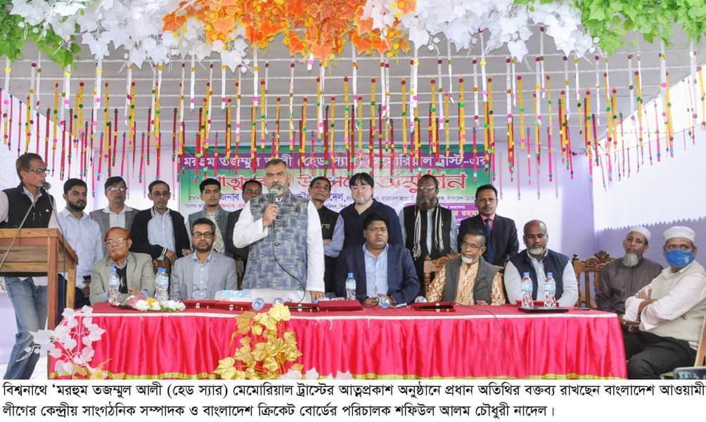 বাংলাদেশ আওয়ামী লীগের কেন্দ্রীয় সাংগঠনিক সম্পাদক ও বাংলাদেশ ক্রিকেট বোর্ডের পরিচালক শফিউল আলম চৌধুরী নাদেল বলেছেন, বিশ্বনাথবাসীর প্রিয় ‘হেড স্যার’ মরহুম তজম্মুল আলী জীবদ্দশায় এ অঞ্চলের শিক্ষার উন্নয়নে গূরুত্বপূর্ণ ভূমিকা পালন করেছেন। সকল সংকঠ মুহুর্তে তিনি ছিলেন উপজেলাবাসী অভিভাবক। মানুষ গড়ার এই মহান কারিগরের অনেক ছাত্রই আজ দেশের বিভিন্ন সেক্টরে গূরুত্বপূর্ণ পদে অধিষ্ঠিত হয়ে দেশ ও জাতির কল্যাণে কাজ করছেন। হেড স্যারের শূন্যতা কখনই পূরণ হওয়ার নয়। নিজ কর্মগুনেই তিনি মানুষের অন্তরে বেঁচে থাকবেন চিরকাল। সবার প্রিয় হেড স্যারের পরিবারের সদস্যদের উদ্যোগে প্রতিষ্ঠিত ‘মরহুম তজম্মুল আলী (হেড স্যার) মেমোরিয়াল ট্রাস্ট’র মাধ্যমে এলাকার অবহেলিত-বঞ্চিত-গরীব মানুষেরা উপকৃত হবেন।