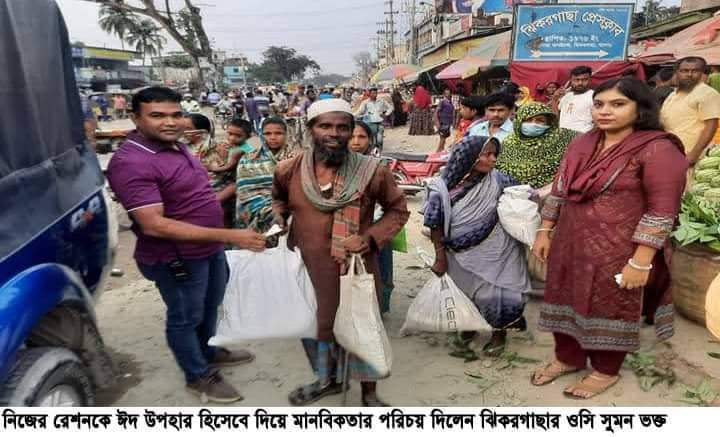 নিজের রেশনকে ঈদ উপহার হিসেবে দিয়ে মানবিকতার পরিচয় দিলেন যশোরের ঝিকরগাছা থানার অফিসার ইনচার্জ (ওসি) সুমন ভক্ত। ভিক্ষুক মুক্ত ঝিকরগাছা উপজেলার পৌর বাজারের খুঁজে পাওয়া ২০জন ভিক্ষুকদের মাঝে, সরকারি কর্মকর্তা হিসেবে নিজের প্রাপ্য ৩মাসের রেশন বিতরণ করেছেন। মানবিক থানার অফিসার ইনচার্জ (ওসি) সুমন ভক্ত বলেন, মাননীয় প্রধানমন্ত্রীর চিরন্তনবাণী ধর্ম যার যার উৎসব সবার। যার জন্য অসহায়, দুস্থ, অবহেলিত পরিবারের সদস্যরা বাজারের ভিক্ষা করতে দেখে আমার সহধর্মিণীর সাথে একান্ত পরামর্শে আমার নিজের ৩মাসের জমানো রেশন ঈদ উপহার হিসেবে তাদেরকে দিতে পেরে আমি খুব আনন্দিত। রেশন হতে প্রাপ্ত চাল, ডাল, তেল, চিনি এবং ময়দার পরিবর্তে সংগৃহীত দুধ ও সেমাই দ্বারা কর্মহীন, শারীরিক ও আর্থিকভাবে অসচ্ছল পরিবারকে আপ্যায়ন করার সুযোগ পেয়ে আমরা গর্বিত। ধন্যবাদ জ্ঞাপন করছি যারা আমার এই কাজে সহযোগিতা করেছে, আমার সেই সকল সহকর্মীদের। বিশেষভাবে কৃতজ্ঞতা প্রকাশ করছি এই কাজের উৎসাহ দাতা ও সার্বিক সহযোগিতাকারী আমার অর্ধাঙ্গিনীকে। সচেতন মহলের নিকট আমার দাবী আপনারাও অসহায় মানুষের পাশে দাঁড়ান। এসময় তার সফর সঙ্গী ছিলেন সহধর্মিণী রাখি বিশ্বাস।