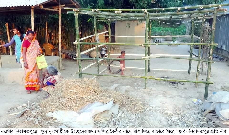 নওগাঁর নিয়ামতপুরে মন্দির তৈরীর নামে ক্ষুদ্র নৃ-গোষ্ঠীকে উচ্ছেদের চেষ্টা করার অভিযোগ পাওয়া গেছে। এ নিয়ে থানায় একটি লিখিত অভিযোগ দায়ের করেছেন ভুক্তভোগী ঐ ক্ষুদ্র নৃ-গোষ্ঠী।