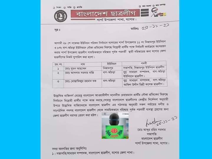 আসন্ন ইউপি নির্বাচনে নৌকার বিরুদ্ধে গিয়ে বিদ্রোহী প্রার্থীর পক্ষে নির্বাচনী কার্যক্রমে অংশ নেওয়ায় শার্শা উপজেলার ৩ ছাত্রলীগ নেতাকে সাময়িকভাবে বহিষ্কার ও স্থায়ীভাবে বহিষ্কারের জন্য যশোর জেলা ছাত্রীলীগের নিকট সুপারিশ করা হয়েছে।