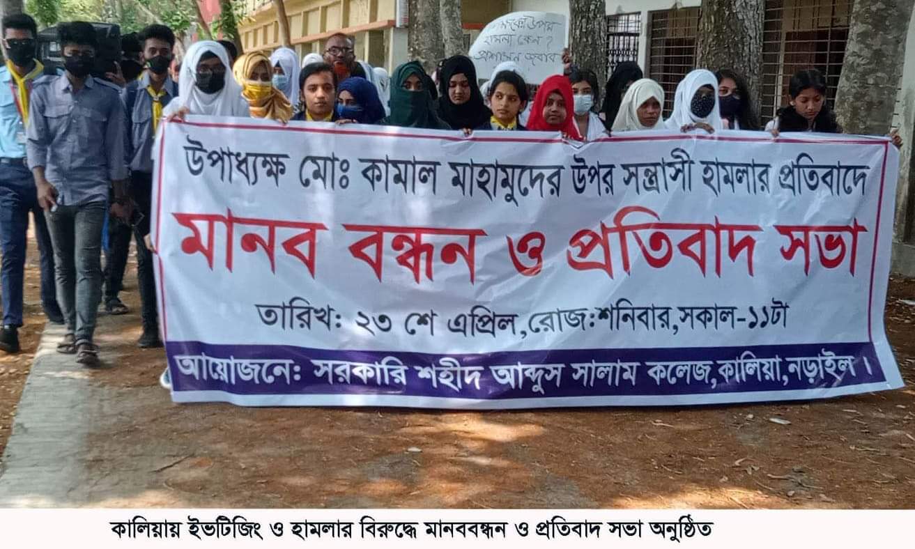 নড়াইলের কালিয়ায় ইভটিজিং ও উপাধ্যক্ষের ওপর হামলার প্রতিবাদে মানববন্ধন ও প্রতিবাদ সভা অনুষ্ঠিত হয়েছে। উপজেলার বিলবাউজ গ্রামের তবিবর মোল্যার ছেলে ইভটিজার ও হামলাকারী ও অত্র কলেজের বহিস্কৃত ছাত্র রায়হান মোল্যার শাস্তির দাবিতে ২৩ এপ্রিল (শনিবার) সকাল ১১ টায় সরকারি শহীদ আব্দুস সালাম কলেজের সামনে এ মানববন্ধন অনুষ্ঠিত হয়। শহীদ আব্দুস সালাম কলেজের আয়োজনে অনুষ্ঠিত মানববন্ধন ও প্রতিবাদ সভায় বক্তব্য রাখেন, উপাধ্যক্ষ কামাল মাহামুদ, প্রভাষক শাম্মি আক্তার, প্রভাষক শাহাদত হোসেন, প্রভাষক নাসরিন সুলতানা প্রমুখ। বক্তারা বলেন, ২০১৯ সাল থেকেই রায়হান মোল্যা কলেজের অসংখ্য ছাত্রীদের সাথে অশোভন আচারন করায় ভুক্তভোগী ছাত্রীরা কলেজ কর্তৃপক্ষের নিকট লিখিত অভিযোগ করলে ২০২০ সালের ১৪ জানুয়ারী মিটিংএর মাধ্যমে তাকে কলেজ থেকে বহিস্কার করা হলেও রাজনৈতিক ছত্রছাঁয়ায় কলেজে তার অপকর্ম চালিয়ে যাচ্ছে। এ বিষয়ে মামলা করতে গেলে কালিয়া থানায় মামলা না নিয়ে রাজনৈতিক ব্যক্তিদের সমন্বয়ে সামাজিকভাবে বারবার মিমাংসা করে দিলেও থেমে থাকেনি তার অপকর্ম। কলেজের মহিলা প্রভাষকদের সাথেও অভিযুক্ত রায়হান মোল্যা খারাপ আচার করেছে বলে বক্তব্যে তারা জানান। এরই ধারাবাহিকতায় চলতি মাসের ২১ এপ্রিল উপাধ্যক্ষ কামাল মাহামুদকে কালিয়া রেজিষ্ট্রী অফিসের সামনে মোটরসাইকেলে থাকা অবস্থায় রায়হান মোল্যা হামলা করে আহত করে। ওই দুষ্ট চক্রের কবল থেকে কলেজ রক্ষাসহ ছাত্রী ও শিক্ষকদের নিরাপত্তা প্রদান এবং প্রশাসনের প্রতি রায়হানের কঠোর সাজার আহ্বান জানান বক্তারা। এ সময় আরো উপস্থিত ছিলেন, প্রভাষক আবু সাইদ, প্রভাষক খোকন, প্রভাষক পরেশ চন্দ্র দাশ, প্রভাষক লিপটন সাহা, সাইদুর রহমান, আব্দুল আলীম, অর্পনা রানী দাশ, বাতেন, রত্না দে, নাছরিন সুলতানা সহ শিক্ষার্থীরা। মানবন্ধন শেষে রায়হান মোল্যার শাস্তির দাবিতে প্রতিবাদ ও বিক্ষোভ মিছিল কলেজ সংলগ্ন রাস্তা প্রদক্ষিন করে শেষ হয়।