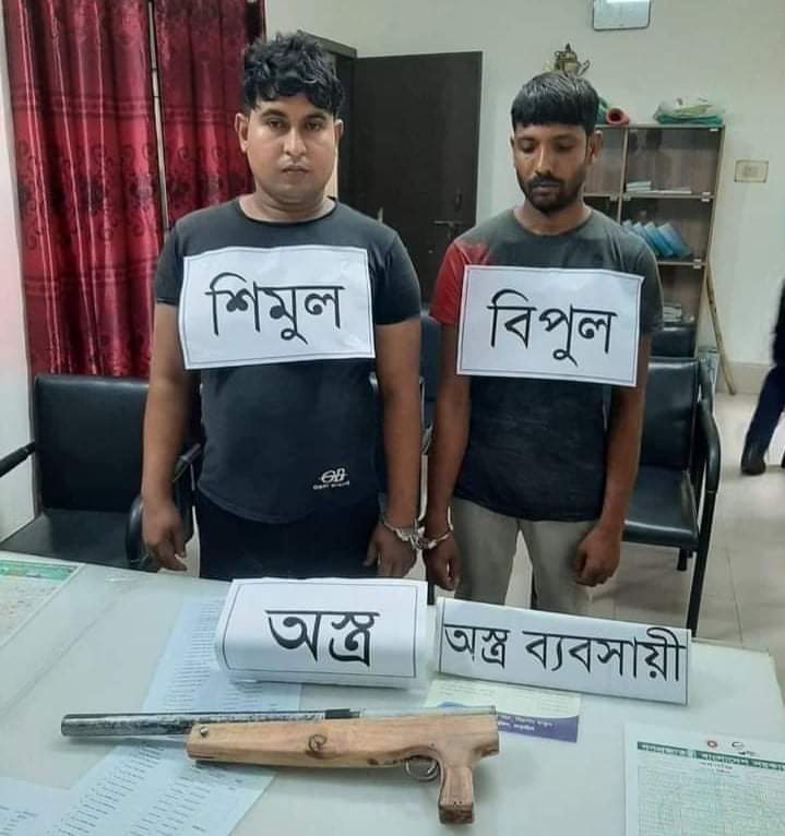 নড়াইলের কালিয়া থানাধীন ভোমবাগ গ্রাম থেকে দেশীয় বন্দুকসহ ২ যুবককে আটক করেছে কালিয়া থানা পুলিশ। আজ(১০আগষ্ট) মঙ্গলবার গভীর রাতে গোপন সংবাদের ভিত্তিতে কালিয়া থানাধীন ভোমবাগ গ্রামে দুইজনে দেশীয় অস্ত্র (পাইপগান) নিয়ে ঘোরাঘুরি করছে। এমন সংবাদের ভিত্তিতে সহকারী পুলিশ সুপার (কালিয়া সার্কেল) প্রণব কুমার সরকার সঙ্গীয় ফোর্সসহ ওসি কালিয়া,কনি মিয়া ভোমবাগ গ্রামে অভিযান চালিয়ে মঙ্গলবার দিবাগত রাত আনুমানিক ২:৩০ ঘটিকার সময় দেশীয় বন্দুকসহ ২ জনকে আটক করা হয় গ্রেফতারকৃতরা ভোমবাগ গ্রামের মোহাম্মদ জাহের বিশ্বাসের ছেলে মোঃশিমুল হোসেন (বিল্লাল) (২৫) এবং একই গ্রামের মৃত শামছুর রহমানের ছেলে মোহাম্মদ বিপুল হোসেন (২৭)। উভয়কে হাতিয়ার সহ গ্রেফতার করে আইনি ব্যবস্থা গ্রহণ করে জেল হাজতে প্রেরণ করা হয়েছে।