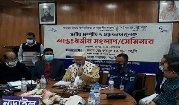 ধর্ম যার যার রাষ্ট্র সবার,এই প্রতিপাদ্যকে সামনে রেখে নড়াইলে ধর্মীয় সম্প্রতি ও সচেতনতামুলক আন্তঃধর্মীয় সংলাপ সেমিনার অনুষ্ঠিত হয়েছে। ১৫ নভেম্বর সোমবার দুপুরে জেল ধর্মীয় সম্প্রতি ও সচেনতা বৃদ্ধিকরণ প্রকল্পের আয়োজনে জেলা প্রশাসক মোঃ হাবিবুর রহমানের সভাপতিত্বে সেমিনার অনুষ্ঠিত হয়।