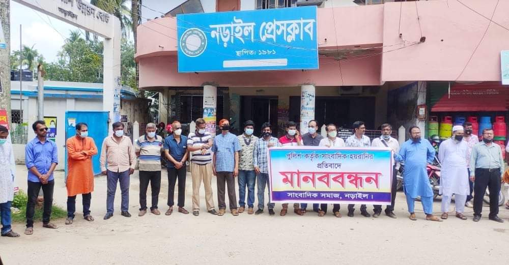 পুলিশের বিরুদ্ধে সংবাদ প্রকাশের জের ধরে নড়াইল প্রেসক্লাবের সদস্য, দেশ টেলিভিশনের নড়াইল জেলা প্রতিনিধি এবং নড়াইল নিউজ ২৪.কম এর সম্পাদক ও প্রকাশক শরিফুল ইসলাম বাবলুকে পুলিশ কর্তৃক হয়রানির প্রতিবাদে মানববন্ধন অনুষ্ঠিত হয়েছে। সাংবাদিক সমাজের আয়োজনে শুক্রবার (২৪ সেপ্টেম্বর) দুপুরে নড়াইল প্রেসক্লাবের সামনে এ মানববন্ধন অনুষ্ঠিত হয়।