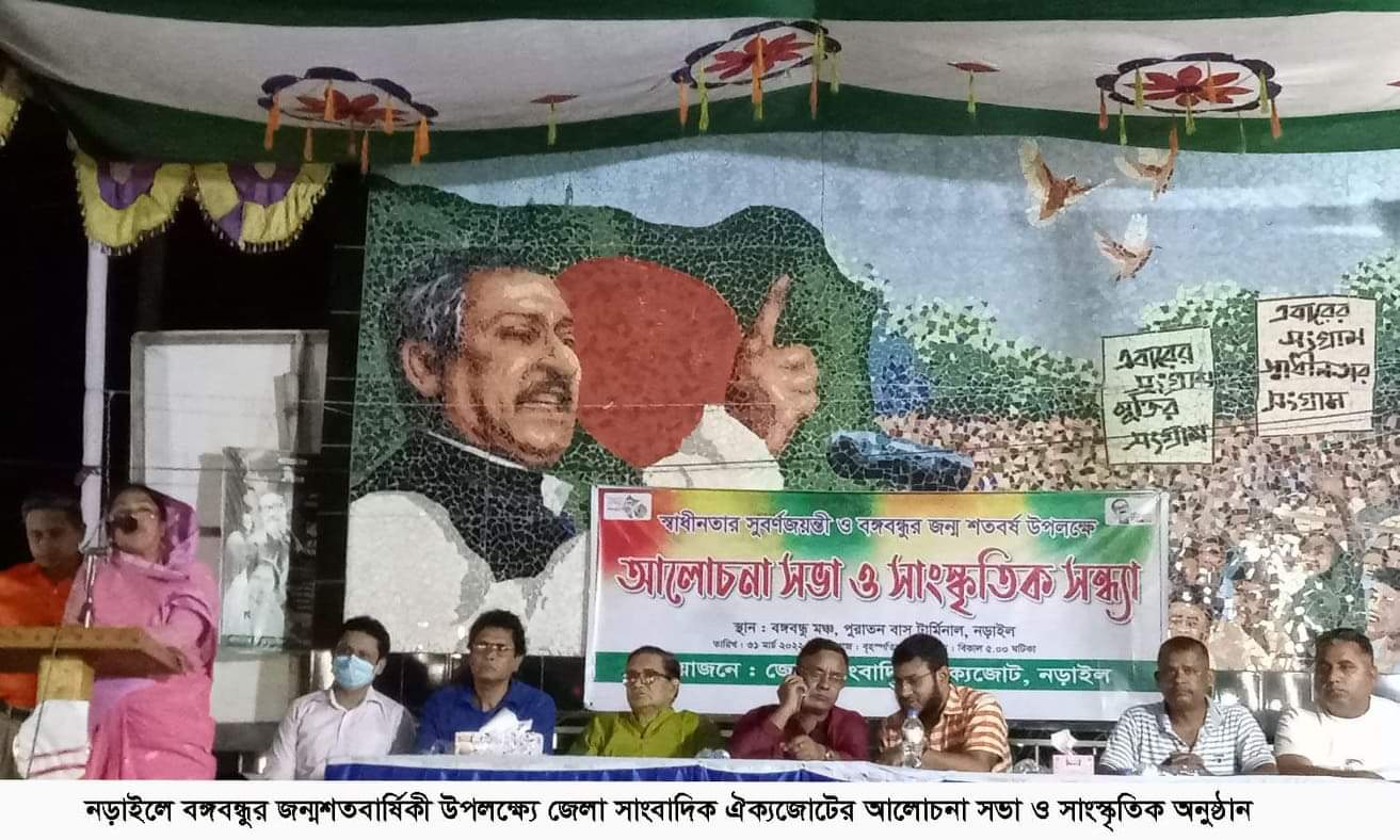 জাতীর জনক বঙ্গবন্ধু শেখ মুজিবুর রহমানের জন্মশত বার্ষিকী ও স্বাধীনতার সুবর্ণ জয়ন্তী উপলক্ষ্যে নড়াইলে আলোচন সভা ও সাংস্কৃতিক সন্ধ্যা অনুষ্ঠিত হয়েছে। বৃহস্পতিবার (৩১ মার্চ) বিকালে জেলা সাংবাদিক ঐক্যজোটের আয়োজনে পুরাতন বাস র্টামিনালস্থ বঙ্গবন্ধু মঞ্চে এ আলোচনা সভা ও সাংস্কৃতিক সন্ধ্যার আয়োজন করা হয়। জেলা সাংবাদিক ঐক্যজোটের আহবায়ক ও জেলা প্রেসক্লাবের সভাপতি খায়রুল আরেফিন রানার সভাপতিত্বে ও জেলা সাংবাদিক ঐক্য জোটের সদস্য সচিব ও জেলা সাংবাদিক ইউনিটি'র সাধারণ সম্পাদক মোঃ জিয়াউর রহমান জামী'র সঞ্চালনায় বিশেষ অতিথী হিসাবে উপস্থিত ছিলেন পুলিশ সুপার প্রবীর কুমার রায়, জেলা আওয়ামী লীগের সভাপতি এডঃ সুবাস চন্দ্র বোস, জেলা আওয়ামীলীগের সহ-সভাপতি ও পৌর মেয়র আজ্ঞুমান আরা, অতিরিক্ত জেলা ম্যাজিস্ট্রেট দেবাশিষ চৌধুরী, জেলা আইনজীবি সমিতির সভাপতি ও বীর মুক্তিযোদ্ধা এডঃ ওমর ফারুক, জাতীয় গোয়েন্দা সংস্থার উপ-পরিচালক মোঃ মিজানুর রহমান, জেলা তথ্য অফিসার মোঃ ইব্রাহিম আল-মামুন, সাংবাদিক ঐক্য জোটে নেতা ও জেলা প্রেসক্লাবের সাধারণ সম্পাদক এডভোকেট এমডি আজিজুল ইসলাম, ঐক্য জোট নেতা ও জেলা রিপোর্টার্স ইউনিটির সভাপতি হুমায়ুন কবীর রিন্টুপ্রমুখ। বক্তরা জাতীর জনক বঙ্গবন্ধু শেখ মুজিবুর রহমানের কর্ম ও রাজনৈতিক জীবন তথা দেশের স্বাধীনতা অর্জনে তাঁর অবদানের ওপর আলোচনা করেন । আলোচনা শেষে মনোঞ্জ সাংস্কৃতি অনুষ্ঠান হয়। তিন ঘন্টাব্যাপি সাংস্কৃতিক অনুষ্ঠানে বাংলাদেশ টেলিভিশন, যশোর, খুলনা সহ নড়াইলের স্থানীয় শিল্পীরা বিভিন্ন ধরনের সংগীত পরিবেশন করেন।