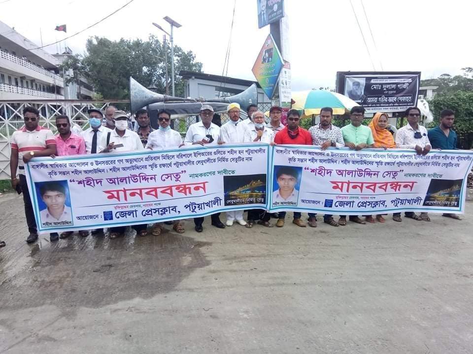 উনসত্তরের গন অভুত্থানে প্রতিবাদের মিছিলে বরিশাল অশ্বিনী কুমার টাউন হলের সামনে ইপিআর এর গুলিতে শহীদ পটুয়াখালী'র কৃতি সন্তান আলাউদ্দিন এর নামে লেবুখালী'তে পায়রা নদীর উপর নির্মিত নান্দনিক সেতুটি শহীদ আলাউদ্দিন এর নামে নামকরণের দাবীতে পটুয়াখালী জেলা প্রশাসকের কার্য্যালয়ের সামনে মানববন্ধন অনুষ্ঠিত হয়েছে।
