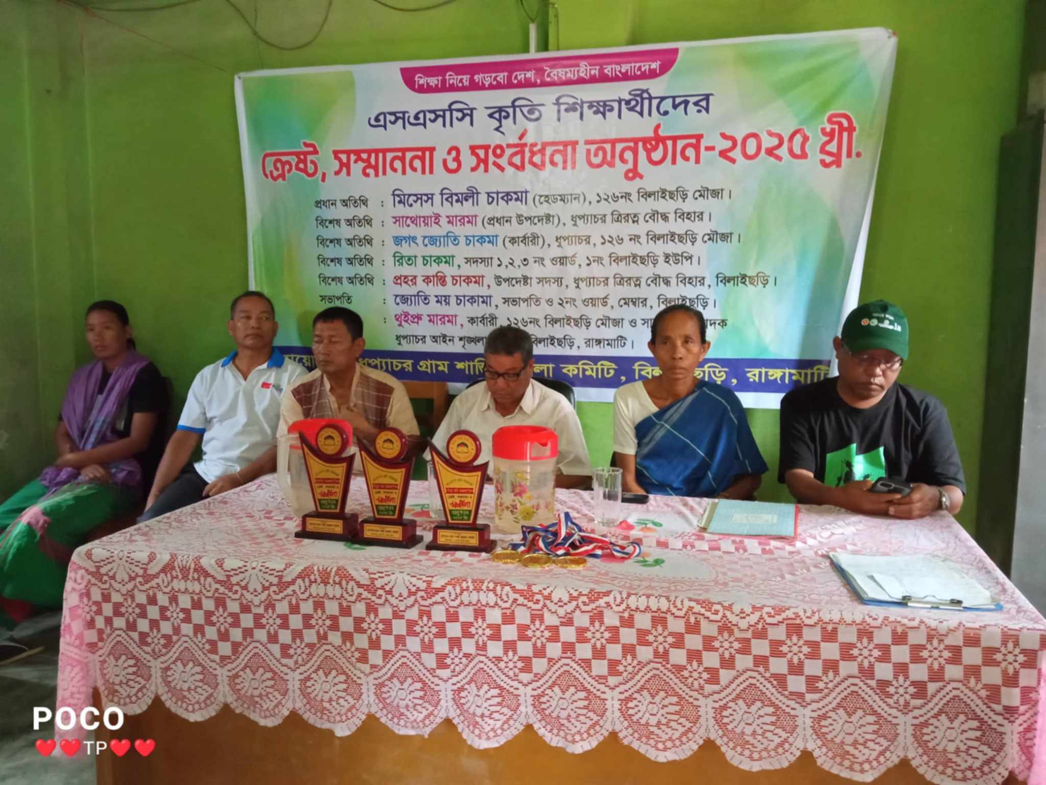 সভাপতিত্ব করেন জ্যোতি ময় চাকমা, সভাপতি ও ২ নং ওয়ার্ড ১ নং বিলাইছড়ি ইউনিয়ন পরিষদ ।অনুষ্টান সঞ্জালনা করেন,বাবুঃথুই প্রু মারমা (আকাশ) সাধারন সম্পাদক ধুপ্যাচর গ্রাম শান্তি শৃঙ্খলা কমিটি । আর ও উপস্থিত ছিলেন,স্থানীয় গন্যমান্য ব্যক্তিবর্গ ও শিক্ষার্থী অভিভাবক ও ক্লাবের সদস্য নেতৃবৃন্দ। অনুষ্ঠানে বক্তারা বলেন যে,প্রতি বছর ধুপ্যাচর পাড়া থেকে যারা এসএসসি পরীক্ষায় ভাল রেজাল্ট করেন,তাদের কে নিয়ে ধারাবাহিক ভাবে ধুপ্যাচর গ্রাম শান্তি শৃঙ্খলা কমিটির পক্ষ থেকে ক্রেষ্ট ও সম্মাননা প্রদান করা হয়,এরই ধারাবাহিকতায় অত্র পাড়া থেকে এ বছর ৩ জন পরীক্ষার্থী এসএসসি পরীক্ষায় অংশগ্রহণ করে সফলতার সাথে কৃতকার্য হয়েছে,তাদের কে সমাজের বিভিন্ন পেশার শ্রেণী মানুষরা অভিনন্দন ও ধন্যবাদ জানিয়েছেন,আলোকিত করেছেন পরিবার ও এই সমাজ কে,আমরা সত্যি গর্বিত,তাদের কে নিয়ে,তারা যেন সুশিক্ষায় শিক্ষিত হয়ে সমাজে শিক্ষার আলো ছড়িয়ে দিতে পারেন,তারা যেন মানুষের মত মানুষ হয়ে সমাজ ও দেশ মাতৃকার সেবায় নিজেদেরকে নিয়োজিত করতে পারেন এটাই সাধারন মানুষের প্রত্যাশা। এসএসসি কৃতি শিক্ষার্থীরা হলেন ১। মিতুন জয় তঞ্চঙ্গ্যা পিতাঃ মেনক্যা তঞ্চঙ্গ্যা,মাতাঃ রিনা মার্মা,২। সুপর্না তঞ্চঙ্গ্যা পিতাঃ রাজ্জাক তঞ্চঙ্গ্যা,মাতাঃ শিল্পী রানী তঞ্চঙ্গ্যা ৩। নিতা মনি তঞ্চঙ্গ্যা পিতাঃ নতুন বাবু তঞ্চঙ্গ্যা মাতাঃ শান্তনি তঞ্চঙ্গ্যা,এই কৃতি শিক্ষার্থীদের জীবন সফলতা কামনা করে অনুষ্ঠান টি সমাপ্তি করা হয়।