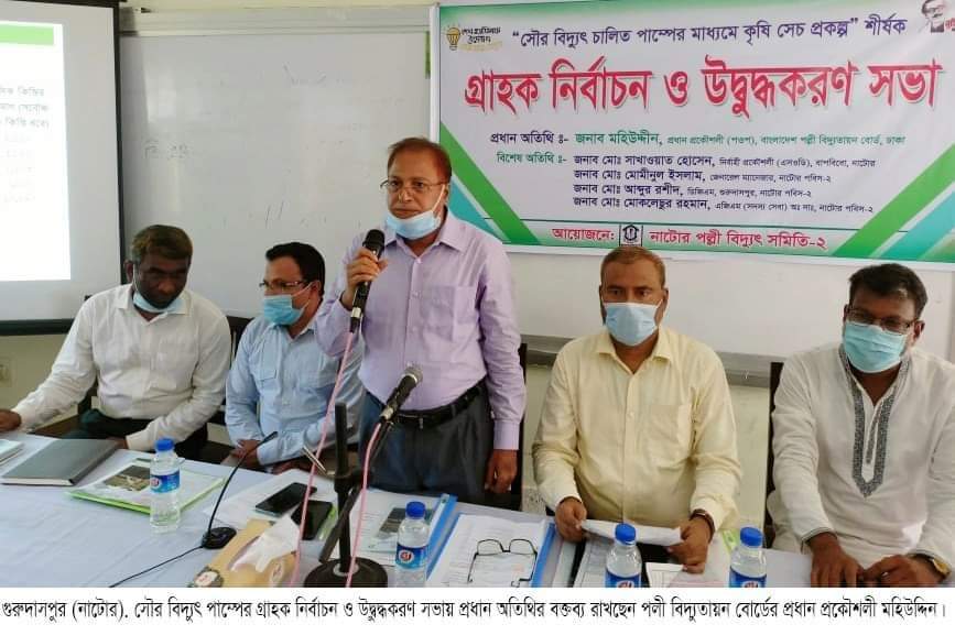রোববার বিকালে বড়াইগ্রামের জোনাইল বাজারে নাটোর পল্লী বিদ্যুৎ সমিতি-২ এর উদ্যোগে আয়োজিত ‘সৌর বিদ্যুৎ চালিত পাম্পের মাধ্যমে কৃষি সেচ প্রকল্প’ শীর্ষক উদ্বুদ্ধ করণ সভায় এসব তথ্য জানান বক্তারা। সভায় টেলিকনফারেন্সে বক্তব্য রাখেন বাংলাদেশ পল্লী বিদ্যুতান বোর্ডের চেয়ারম্যান মেজর জেনারেল মঈন উদ্দিন (অব:)। সভায় প্রধান অতিথি হিসাবে বক্তব্য রাখেন পল্লী বিদ্যুতায়ন বোর্ডের প্রধান প্রকৌশলী মহিউদ্দিন। জোনাইল ইউপি চেয়ারম্যান তোজাম্মেল হকের সভাপতিত্বে সভায় বিশেষ অতিথি হিসাবে বিদ্যুতায়ন বোর্ড নাটোরের নির্বাহী প্রকৌশলী মো: শাখাওয়াত হোসেন, নাটোর পল্লী বিদ্যুৎ সমিতি-২ এর জিএম মো: মোমীনুল ইসলাম, ডিজিএম মো: আব্দুর রশিদ, এজিএম ওয়াদুদ হোসেন, এজিএম (সদস্য সেবা) মোকলেছুর রহমান ও জোনাইল ইউনিয়ন আওয়ামীলীগের সাধারণ সম্পাদক নজরুল ইসলাম বক্তব্য রাখেন। সভায় সৌর বিদ্যুৎ চালিত সেচ পাম্প দেয়ার জন্য ১২ জন গ্রাহক নির্বাচন করা হয়। এর আগে গুরুদাসপুরেও প্রধান শিক্ষক মাহবুব আলম লাবুর সভাপতিত্বে অনুরুপ সভা অনুষ্ঠিত হয়েছে।