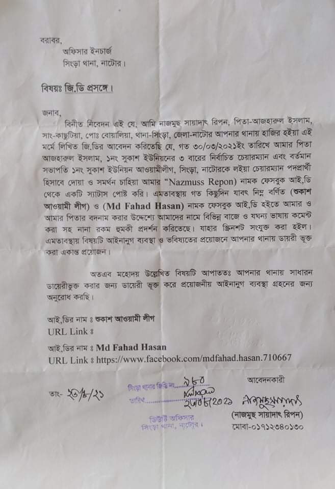 সাধারণ ডায়েরি সূত্রে জানা যায়, কে বা কাহারা উদ্দেশ্যপ্রণোদিত হয়ে শুকাশ আওয়ামী লীগ ও Md Fahad Hasan নামক দুইটি ফেসবুক আইডি থেকে ইউনিয়ন আওয়ামী লীগের সভাপতিকে মানহানির লক্ষ্যে রাজনৈতিক ও সামাজিকভাবে তাঁর জনপ্রিয়তা ঈর্ষান্বিত হয়ে তাঁকে সমাজে হেয় প্রতিপন্ন করার উদ্দেশ্যে তাঁর বিরুদ্ধে মিথ্যা, বানোয়াট, কু-রুচিপূর্ণ, অশালীন স্ট্যাটার্স, কমেন্ট ও আপত্তিকর লেখা দিয়ে রাজনৈতিক ও সামাজিক ভাবে হেয় প্রতিপন্ন করিয়া আসছে বলে অভিযোগে উল্লেখ করা হয়।