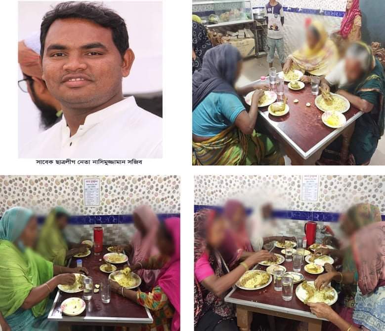নাটোরের সিংড়ায় শোকের মাসব্যাপী অসহায়, পথচারী ও ভিক্ষুকদের খাবার খাওয়ালেন সাবেক ছাত্রলীগ নেতা সজিব। নাসিমুজ্জামান সজিব সিংড়া পৌর ছাত্রলীগের সাবেক সিনিয়র সহ-সভাপতি ও পৌর শহরের নিংগইন এলাকার স্থায়ী বাসিন্দা। সে পেশায় একজন মৎস্য খামারী।