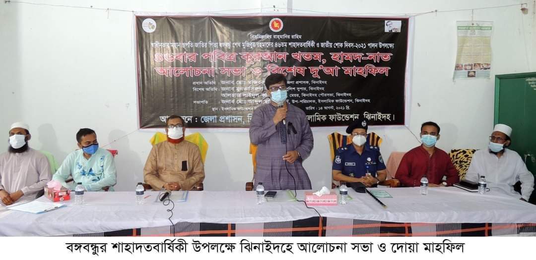 জাতির পিতা বঙ্গবন্ধু শেখ মুজিবুর রহমানের ৪৬ তম শাহাদত বার্ষিকী ও জাতীয় শোক দিবস উপলক্ষে ঝিনাইদহে আলোচনা সভা দোয়া মাহফিল অনুষ্ঠিত হয়েছে। শনিবার সকালে জেলা ইসলামিক ফাউন্ডেশনের কার্যালয়ে এ আলোচনা সভার আয়োজন করা হয়। ইসলামি ফাউন্ডেশনের উপ-পরিচালক আব্দুল হামিদ খানের সভাপতিত্বে অনুষ্ঠানে প্রধান অতিথি হিসেবে উপস্থিত ছিলেন জেলা প্রশাসক মজিবর রহমান। বিশেষ অতিথি হিসেবে উপস্থিত ছিলেন পুলিশ সুপার মুনতাসিরুল ইসলাম, এনডিসি কামরুজ্জামান সরকার, নির্বাহী ম্যাজিস্ট্রে শরিফুল হক, ইফা’র মাস্টার ট্রেইনার মাওলানা আব্দুল্লাহ আল মামুন ও হাফেজ মো: জাকির হোসেন প্রমুখ। আলোচনা শেষে জাতির পিতার আত্মার মাগফেরাত কামনা করে বিশেষ মোনাজাত করা হয়। এর আগে ৪৬ তম শাহাদতবার্ষিকী উপলক্ষে ৪৬ বার কুরআন খতম দেওয়া হয়।