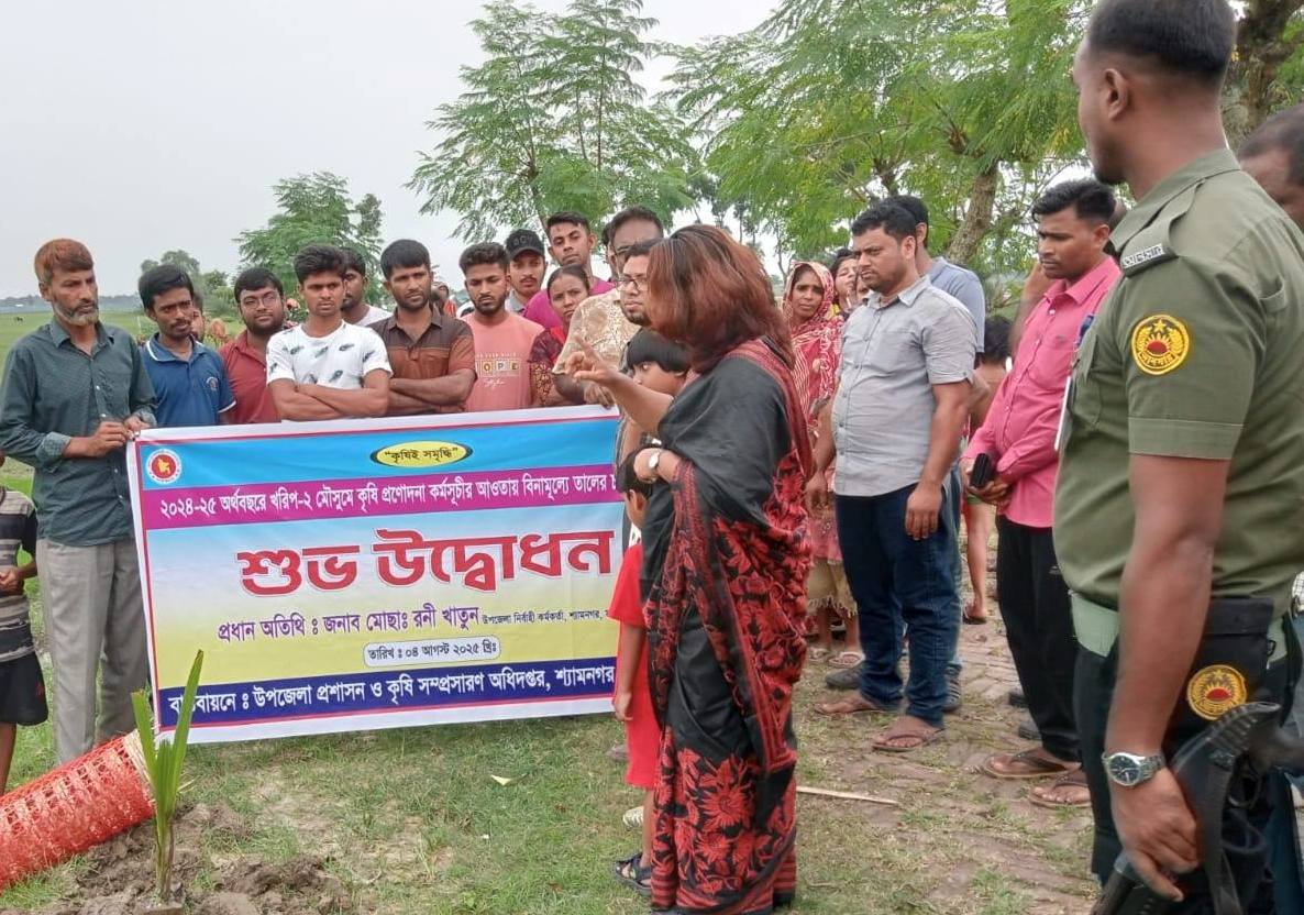 ছবি- শ্যামনগরে গ্রামীন সড়কের পাশে তালের চারা রোপন উদ্বোধন করছেন উপজেলা নির্বাহী অফিসার রণী খাতুন।