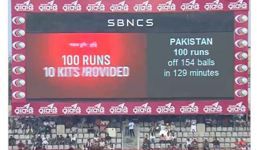 ৮২ রানে নবম উইকেট হারানোর পর একশর আগেই অলআউটের শঙ্কায় পড়ে পাকিস্তান। তবে ফাহিম আশরাফ একাই কিছুটা লড়াই করেন। আবরার আহমেদকে সঙ্গে নিয়ে শেষ উইকেটে ৩২ রানের জুটি গড়েন। ফাহিমের ৩৭ রানের ইনিংসে ভর করে কোনোরকমে একশ পেরিয়ে অলআউট হয় পাকিস্তান।