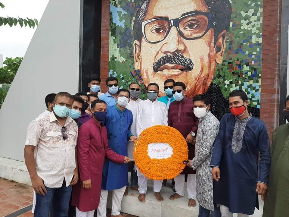 স্বাস্থ্য বিধি মেনে জাতির জনকের প্রতিকৃতিতে পুষ্পস্তবক অর্পণ করা হয়েছে ।