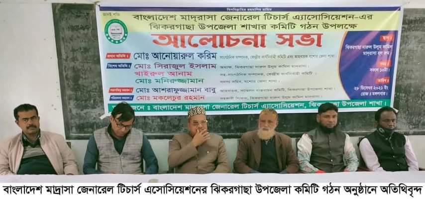 বাংলাদেশ মাদ্রাসা জেনারেল টিচার্স এসোসিয়েশনের যশোরের ঝিকরগাছা উপজেলা কমিটি গঠন উপলক্ষে মঙ্গলবার (২৮ ডিসেম্বর) সকাল ১০ টায় দারুল উলুম কামিল মাদ্রাসার হল রুমে আলোচনা সভা অনুষ্ঠিত হয়েছে। ৩২ টি মাদ্রাসার প্রতিনিধিদের উপস্থিতিতে সর্বসম্মতিক্রমে ঝিকরগাছা দারুল উলুম কামিল মাদ্রাসার বিএসসি শিক্ষক আরশাফুজ্জামান বাবু সভাপতি, পোদাউলিয়া মাদ্রাসার সহকারী শিক্ষক আদম শফিউল্লাহকে সাধারণ সম্পাদক করে ঝিকরগাছা উপজেলা মাদ্রাসা জেনারেল টিচার্স এসোসিয়েশনের কমিটি গঠন করা হয়েছে।