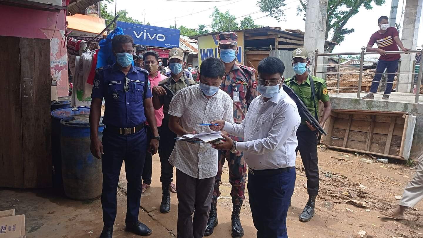 এ সময় দোকানের বারান্দাতে মালামাল রাখার কারনে মেসার্স আলী আহম্মদ ষ্টোরে ২০০০ টাকা, ফল বিতানে ৫০০ টাকা, ফুডল্যান্ট দোকানে ৫০০ টাকা, এসব দোকান মালিকদের সর্ব মোট ৩০০০/ টাকা জরিমানা আদায় করেন। এবং বেশকিছু দোকান মালিককে মৌখিক ভাবে সর্তক করেন। এবং বাজার পরিষ্কার পরিছন্নতা রাখার জন্য অনুরোধ করে। সকলকে মাস্ক পরার পরামর্শের পাশাপাশি অযথা ঘুরাফেরা না করার অনুরোধ জানান