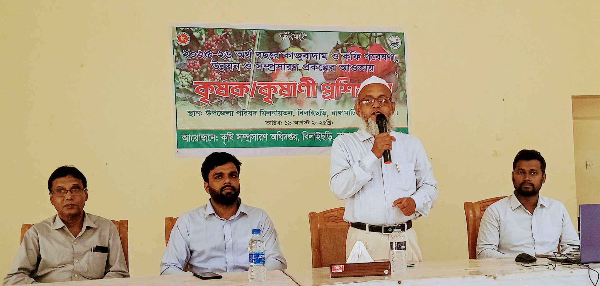 বিলাইছড়ি(রাঙ্গামাটি) প্রতিনিধি- বিলাইছড়িতে ২০২৫-২৬ অর্থ বছরে কাজুবাদাম ও কফি গবেষণা, উন্নয়ন ও সম্প্রসারণ প্রকল্পের আওতায় কৃষক/ কৃষাণীদের মাঝে প্রশিক্ষণ দেওয়া হয়েছে। মঙ্গলবার (১৯ আগস্ট) সকাল ১০:০০ টায় উপজেলা মিলনায়তনে এ প্রশিক্ষণ শুরু হয়। প্রশিক্ষণে কৃষি সম্প্রসারণ অধিদপ্তর বিলাইছড়ি এর আয়োজনে প্রধান অতিথি হিসেবে উপস্থিত ছিলেন কৃষি অধিদপ্তরের উপ-পরিচালক (DD) কৃষিবিদ্ মো. মনিরুজ্জামান।