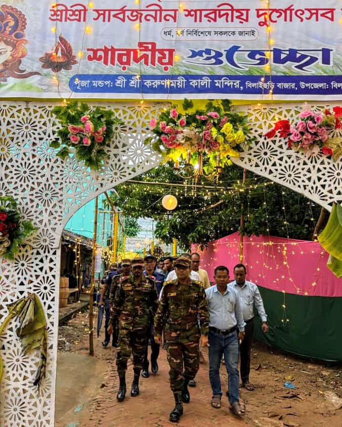 বুধবার ( ১ অক্টোবর) ৪ঃ৩০ ঘটিকায় পূজা উদযাপন কমিটির আয়োজনে প্রধান অতিথি জোন কমান্ডার শ্রী শ্রী করুনাময়ী কালী মন্দিরে পূজা মন্ডপ পরিদর্শন শেষে পূজা উদযাপন কমিটি সঙ্গে আলোচনা করেন। এবং তাদের সুবিধা- অসুবিধার কথা জানেন। পরে তিনি সনাতন ধর্মাবলম্বীদের সঙ্গে শুভেচ্ছা বিনিময় করেন।