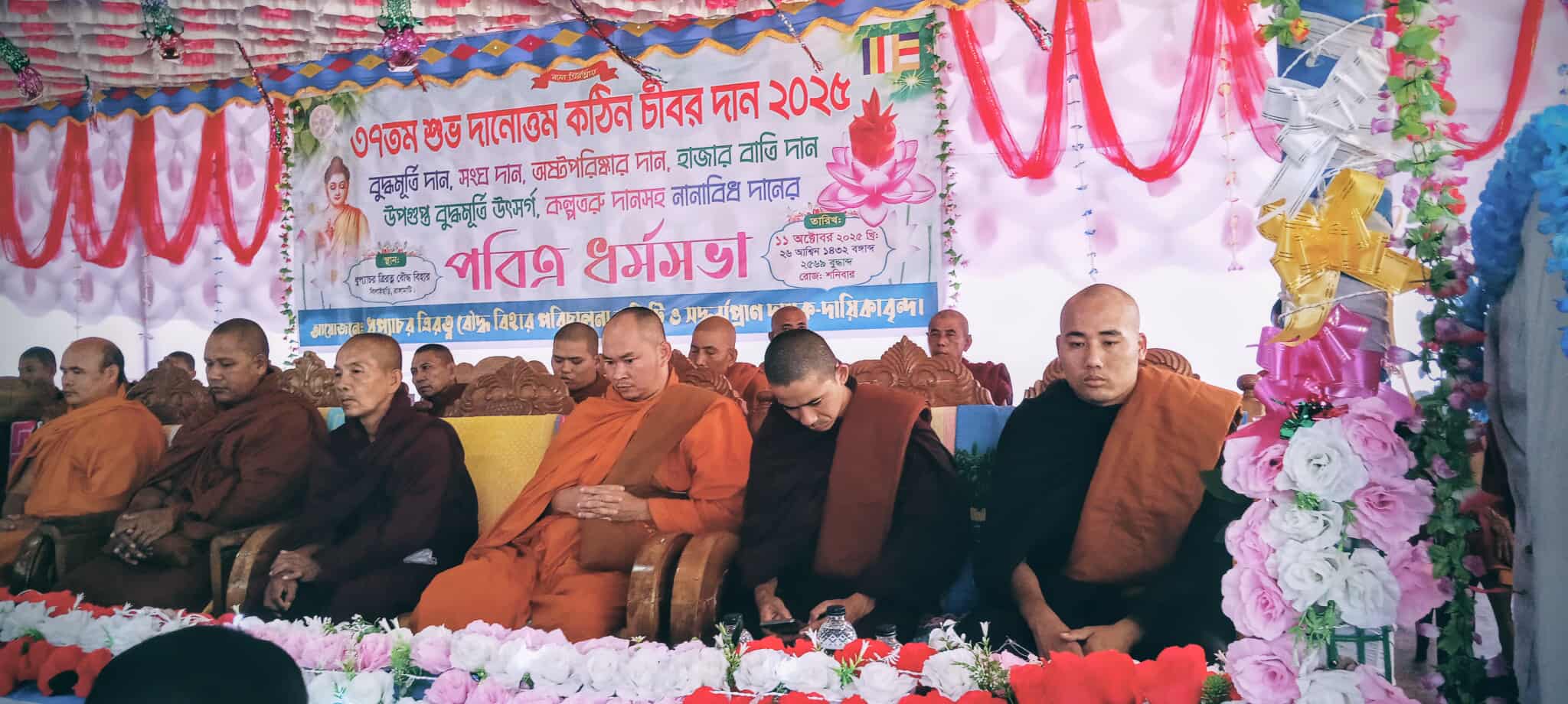 বিলাইছড়ি (রাঙ্গামাটি) প্রতিনিধি-পার্বত্য জেলা বিলাইছড়ি উপজেলার ধুপ্যাচর ত্রিরত্ন বৌদ্ধ বিহারে হাজারো পূণ্যার্থীর অংশগ্রহণে সু- সুম্পন্ন হলো ৩৭ তম দানোত্তম কঠিন চীবর দানোৎসব এবং আষাম মালা তঞ্চঙ্গ্যা'র সংঘদান। শনিবার (১১ অক্টোবর) সকালে ধুপ্যাচর ত্রিরত্ন বৌদ্ধ বিহার পরিচালনা কমিটির আয়োজনে বিহার প্রাঙ্গণে- বুদ্ধ পতাকা উত্তোলন এবং বুদ্ধ পূজা গাথা, পঞ্চশীল পাঠ, বুদ্ধ মূর্তি দান, হাজার বাতি দান, সংঘদান, অষ্টপরিস্কার দান, পিন্ডদান দানসহ নানাবিধ দান আয়োজন করা হয়।