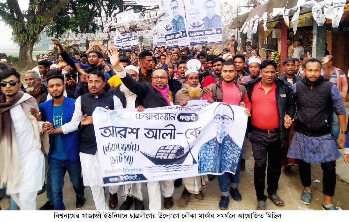 ষষ্ঠ ধাপের অনুষ্ঠিত সিলেটের বিশ্বনাথ উপজেলার ২নং খাজাঞ্চী ইউনিয়ন পরিষদ নির্বাচনে আওয়ামী লীগ মনোনীত প্রার্থী আরশ আলী গনি ‘নৌকা’ প্রতিকের সমর্থনে মিছিল ও নির্বাচনী জনসভা অনুষ্ঠিত হয়েছে। খাজাঞ্চী ইউনিয়ন ছাত্রলীগের উদ্যোগে এবং উপজেলা আওয়ামী লীগের সাবেক আইন বিষয়ক সম্পাদক ও সাবেক এপিপি আলহাজ্ব অ্যাডভোকেট মুজিবুর রহমানের সার্বিক সহযোগীতায় রাজাগঞ্জ বাজারে বৃহস্পতিবার সন্ধ্যায় অনুষ্ঠানের আয়োজন করা হয়।