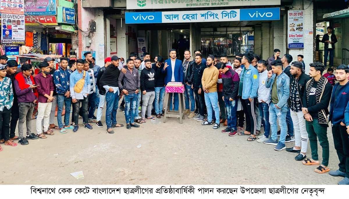 মঙ্গলবার ৪ঠা জানুয়ারী বিকেল সাড়ে ৪টার দিকে পৌর শহরের পুরাণ বাজারস্থ আল-হেরা শপিং সিটির সামনে উপজেলা ছাত্রলীগের সাধারণ সম্পাদক মোবারক হোসাইনের নেতৃত্বে ওই কেক কাটা হয়।