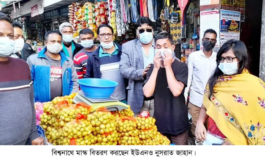 করোনা সংক্রমন প্রতিরোধে জনসচেতনতা বৃদ্ধির লক্ষ্যে সিলেটের বিশ্বনাথ পৌর শহরের নতুন ও পুরাণ বাজার এলাকায় বিভিন্ন শ্রেণী-পেশার মানুষের মধ্যে মাস্ক বিতরণ করা হয়েছে।