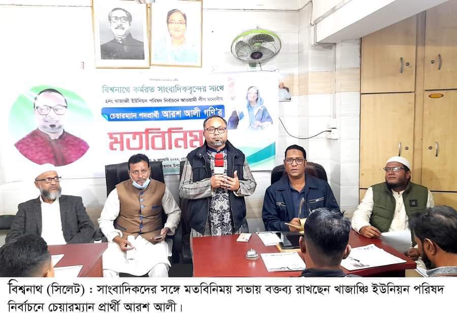 সিলেটের বিশ্বনাথে উপজেলার কর্মরত সাংবাদিকদের সাথে মতবিনিময় করেছেন খাজাঞ্চী ইউনিয়ন পরিষদ নির্বাচনে আওয়ামী লীগ মনোনীত চেয়ারম্যান পদপ্রার্থী নৌকার মাঝি ও সৌদি আরব প্রবাসী আরশ আলী।