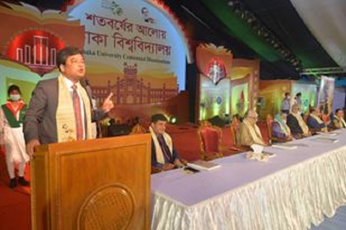 উপাচার্য ড. মশিউর রহমান বলেন, ‘ঢাকা বিশ্ববিদ্যালয় রাজনৈতিক বৈশিষ্ট্যমণ্ডিত হবার মূল কারণ জাতিরাষ্ট্র সৃষ্টি। সেই জাতিরাষ্ট্র সৃষ্টি করার পর একে আদর্শ শিক্ষায়তনে পরিণত করা আবশ্যক। বিজ্ঞান মনস্ক একটি আধুনিক গবেষণা নির্ভর বিদ্যাপীঠ তৈরি করতে হবে এই পাদপীঠকে। ঢাকা বিশ্ববিদ্যালয় বহু অ্যাপ্রোচ আমি মনে করি আধুনিক ও অগ্রসর। বিভিন্ন জনের সমালোচনার বিরুদ্ধে দাঁড়িয়ে বলবো-ঢাকা বিশ্ববিদ্যালয় অন্তর্ভুক্তিমূলক হতে হয়তো আরও কিছুদিন সময় লাগবে। কখনো কখনো বলা হয় এখানে মাদ্রাসা শিক্ষার্থীরা সুযোগ পায় বেশি। এটি ঠিক মাদ্রাসা শিক্ষার্থীদের অন্তর্ভুক্তিমূলক অ্যাপ্রোচ এখানে আছে। এটি একটি বিশ্ববিদ্যালয়ের বৈশিষ্ট্য হওয়া উচিত। যেটি নাই সেটি হচ্ছে ইংরেজি মাধ্যমের শিক্ষার্থীদের ইনক্লুসিভ অ্যাপ্রোচে নিয়ে আসা। এই পদ্ধতিটি এখানে তৈরি করতে হবে। কারণ আমাদের উচ্চবিত্ত, মধ্যবিত্ত পরিবারের সন্তানরা বিদেশগামী হচ্ছে। এটি আমাদের জন্য ভয়ানক ক্ষতির দিক। এইসব মেধাবী অংশকে সংস্কৃতি চর্চা এবং দেশপ্রেমে উদ্বুদ্ধ করার দায়বদ্ধতা আমাদের আছে। এর দায় শুধু ঢাকা বিশ্ববিদ্যালয় একা নিতে পারে না। সুতরাং যেভাবে মাদ্রাসা শিক্ষাকে অন্তর্ভুক্তিমূলক করা হয়েছে, একইভাবে ইংরেজি মাধ্যমের শিক্ষার্থীদের আকৃষ্ট করবার আগামী দিনের যে চ্যালেঞ্জ তার মধ্যদিয়ে ঢাকা বিশ্ববিদ্যালয় অবশ্যই বিজ্ঞান, প্রযুক্তি, উৎকর্ষতায়, শিল্প-সাহিত্যে অনন্য হয়ে উঠবে। এই পাদপীঠে আমাদের অনেক ঋণ। এর প্রতিটি ঐতিহ্য আমাদের পবিত্র আমানত। ঢাকা বিশ্ববিদ্যালয়ের এই আমানত আগামী দিনে অক্ষুণ্ণ থাকবে আজকের শতবর্ষে এই হউক আমাদের দৃঢ় প্রত্যয়। এই প্রতিষ্ঠান আরও উজ্জ্বল হউক, আলোকবর্তিকায় ভরে উঠুক। এর প্রতিটি শিক্ষার্থী আত্মমর্যাদার সঙ্গে বলে উঠুক আমি বঙ্গবন্ধুর বাংলাদেশের ঢাকা বিশ্ববিদ্যালয়ের শিক্ষার্থী। এই হউক আমাদের আগামী দিনের পথ চলার অনুপ্রেরণা।’