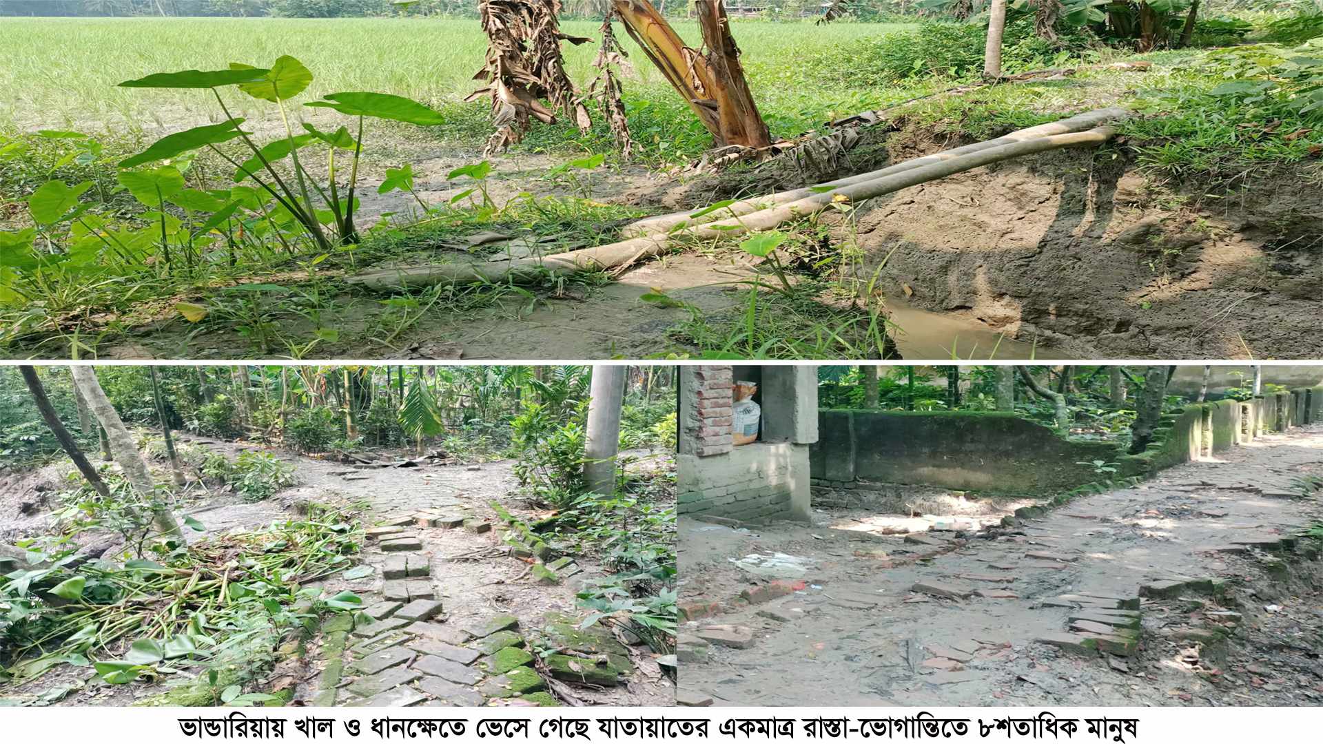 পিরোজপুরের ভান্ডারিয়ায় খাল ও ধানক্ষেতে ভেসে গেছে গ্রামের একমাত্র রাস্তা। এতে ভোগান্তিতে পরেছে প্রায় ৮শতাধিক মানুষ। রাস্তা নং ৫৭৯১৪৫০৭১ ইউএনআর থেকে পোনা নদি ভায়া ফজলুল হক হাওলাদার বাড়ির প্রধান এ রাস্তাটিতে দীর্ঘদিন কোন সংস্কার হয়নি বলে দাবি স্থানীয়দের৷ প্রতিনিত এলাকার স্কুল-কলেজ ও মাদ্রাসার শিক্ষার্থীসহ ভিবিন্ন শ্রেণী-পেশার প্রায় আট শতাধিক মানুষ এ রাস্তাটি থেকে যাতায়াত করেন বলে জানান তারা। মানুষ চলাচলের সম্পূর্ণ অনুপযোগী এ রাস্তাটি উপজেলার ২নং নদমূলা শিয়ালকাঠী ইউনিয়নের ৩নং ওয়ার্ডের মধ্য-পূর্ব চিংগুরিয়া গ্রামের পোস্ট অফিস সংলগ্ন রাস্তা থেকে শুরু হয়ে ডিগ্রি খাল এর পাড়ঘেঁষে সাবেক ইউপি সদস্য আবুল হাসেম মোল্লার বাড়ি সংলগ্ন রাস্তায় শেষ হয়েছে। ২.৮ কিলোমিটার দীর্ঘ এই রাস্তাটির অর্ধেক অংশে ইট থাকলেও বর্ষাকালে ভিবিন্ন যায়গায় গর্ত তৈরি হয়ে জোয়ারের পানিতে ভেসে গেছে ইটসহ রাস্তার মাটি। বাকি অংশের অনেক জায়গাতেই নেই রাস্তার কোন অস্তিত্ব।