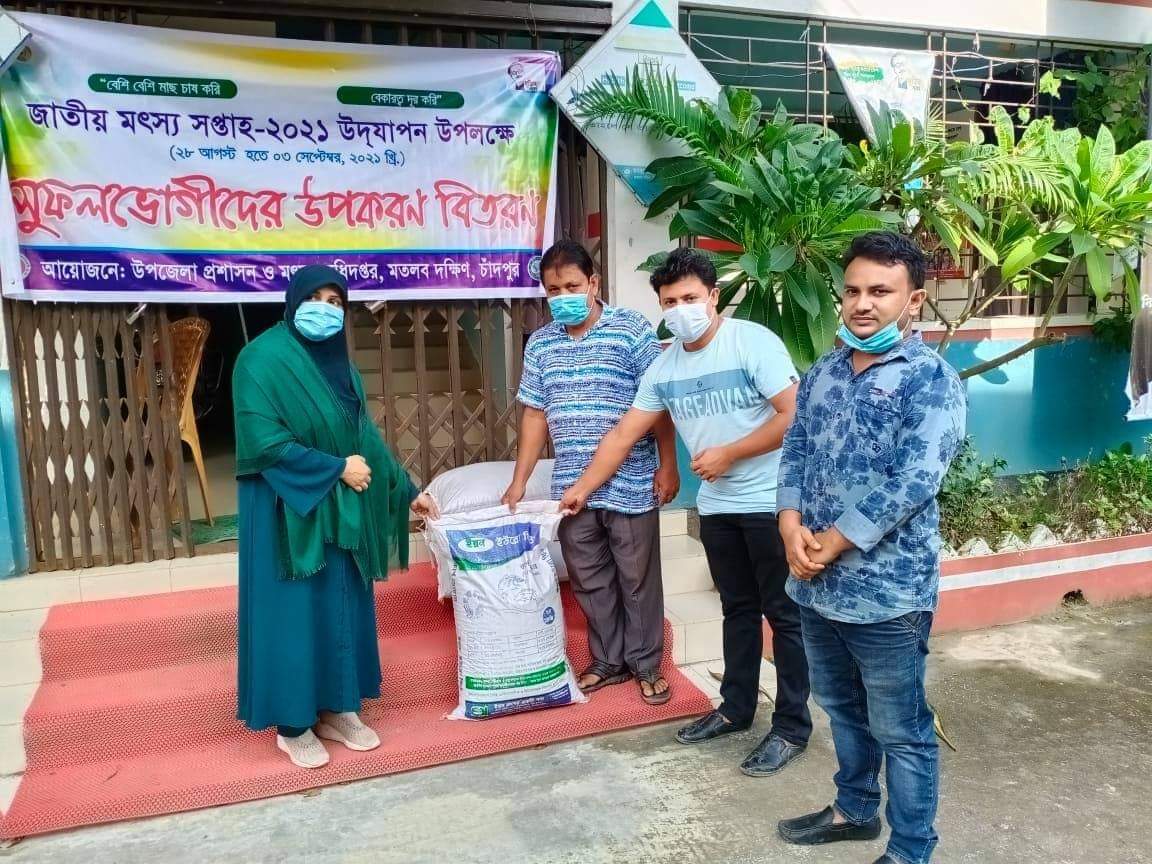 "বেশি বেশি মাছ চাষ করি, বেকারত্ব দূর করি" এই প্রতিপাদ্য সামনে রেখে চাঁদপুর জেলার মতলব দক্ষিণ উপজেলায় জাতীয় মৎস্য সপ্তাহ-২০২১ উদযাপন উপলক্ষে ৬ষ্ঠ দিনে উপজেলা মৎস্য অফিসের আয়োজনে সুফলভোগীদের উপকরণ বিতরণ করেন উপজেলা নির্বাহী অফিসার (ইউএনও) ফাহমিদা হক।