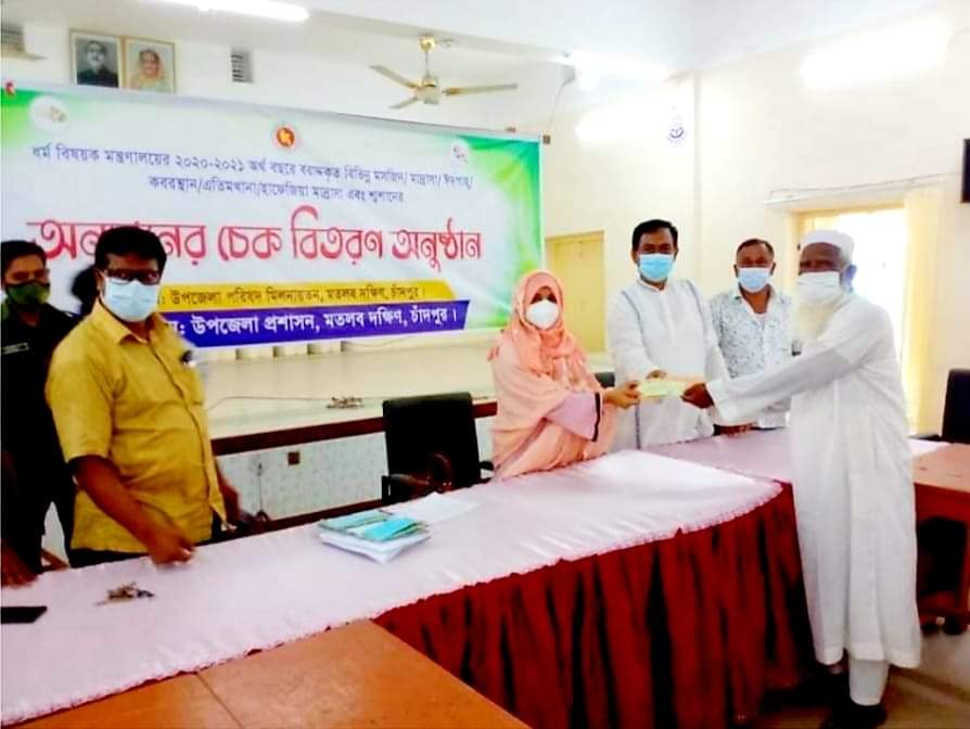 মতলব দক্ষিণ উপজেলায় ধর্ম মন্ত্রনালয়ের অধীনে ২০২০-২০২১ অর্থ বছরে ৫৫টি ধর্মীয় প্রতিষ্ঠানে প্রায় ২০ লক্ষ টাকার অনুদানের চেক বিতরণ করা হয়েছে। ৪ আগস্ট মতলব উপজেলা পরিষদ মিলনায়নে উপজেলা প্রশাসনের আয়োজনে চেক বিতরণ অনুষ্ঠানে প্রধান অতিথি হিসেবে বক্তব্য রাখেন উপজেলা পরিষদের চেয়ারম্যান ও উপজেলা আওয়ামী লীগের সাধারণ সম্পাদক বিএইচএম কবির আহমেদ। উপজেলা নির্বাহী কর্মকর্তা (ইউএনও) ফাহিমদা হকের সভাপতিত্বে চেক বিতরণ অনুষ্ঠানে বক্তব্য রাখেন উপজেলা আওয়ামী লীগের সাবেক যুগ্ম সাধারণ সম্পাদক এম.এ আজিজ বাবুল। এছাড়াও অন্যান্য অতিথিবৃন্দ বক্তব্য রাখেন।