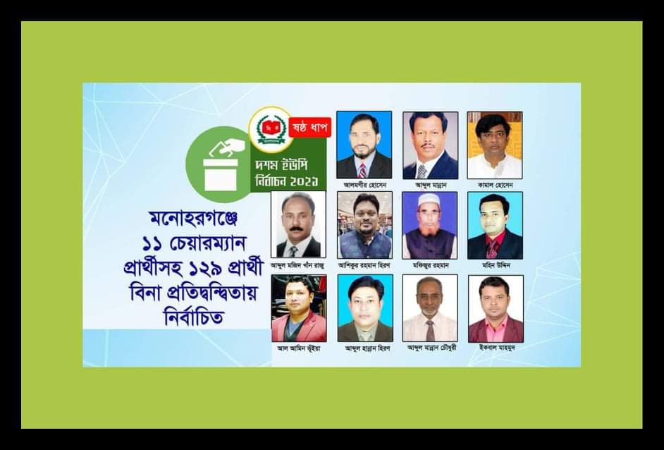 ষষ্ঠ ধাপের ইউনিয়ন পরিষদ নির্বাচনে কুমিল্লার মনোহরগঞ্জে ১১ টি ইউনিয়নে চেয়ারম্যান প্রার্থীসহ ১২৯ প্রার্থী বিনা প্রতিদ্বন্দ্বিতায় নির্বাচিত হয়েছেন। গতকাল বৃহস্পতিবার মনোনয়নপত্র প্রত্যাহারের শেষ দিন উপজেলার ১১ ইউনিয়নে চেয়ারম্যান পদে একক প্রার্থী হওয়ায় ১১ জন বিনা প্রতিদ্বন্দ্বিতায় চেয়ারম্যান নির্বাচিত হন। এছাড়াও সাধারণ মেম্বার ও সংরক্ষিত মহিলা মেম্বার পদে আরো ১১৮ জন বিনা প্রতিদ্বন্দ্বিতায় নির্বাচিত হয়েছেন।