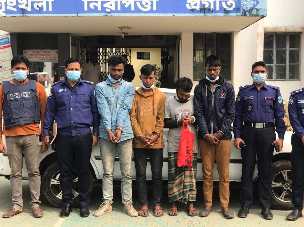চট্টগ্রামে ফি-ফোর্ট এলাকার মো: ওসমান এর ছেলে তুষার(২২), সীতাকুণ্ড উপজেলার দক্ষিণ ছলিমপুর এলাকার ফরিদুল আলমের ছেলে মোঃ শহিদ(২৩), চট্টগ্রাম কালুশাহ এলাকায় মৃত বজলুল হকের ছেলে মোঃ বক্কর(২৬), বাক্ষ্মণবাড়িয়ার কসবা এলাকার জসিম উদ্দিনের ছেলে মোঃ মহসিন (২৩), ভাটিয়ারী হাতেম পাড়া এলাকার মোঃ রফিক এর ছেলে রবিউল হোসেন (২৪),