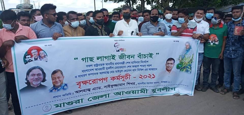 " গাছ লাগাই জীবন বাঁচাই " সফল রাষ্ট্রনাশয়ক মাননীয় প্রধানমন্ত্রীর নির্দেশে বাংলাদেশ আওয়ামী যুবলীগের চেয়ারম্যান ফজলে শামস্ পরশ ও সাধারণ সম্পাদক আলহাজ্জ মাইনুল হোসেন খান নিখিল এর আহবানে বৃক্ষরোপণ কর্মসূচি ২০২১ উপলক্ষে মাগুরা জেলা আওয়ামী যুবলীগের উদ্যোগে ১৯৭৫ টি বিভিন্ন জাতের ফলজ ও বনজ গাছের চারা রোপন করা হয়। ৩১/০৮/২১ মঙ্গলবার সকাল ১০ টায় মাগুরা ১ আসনের সংসদ সদস্য আলহাজ্জ এ্যাড. সাইফুজ্জামান শিখর প্রধান অতিথি থেকে এ বৃক্ষরোপণ কর্মসূচির শুভউদ্বোধন করেন।এসময় উপস্থিত ছিলেন মাগুরা জেলা যুবলীগের আহবায়ক মোঃ ফজলুর রহমান,যুগ্ন আহবায়ক আলী আহম্মেদ আহাদ, জেলা যুবলীগ নেতা বাকী বিল্লাহ সান্টু,শালিখা উপজেলা যুবলীগের আহ্বায়ক মোঃ মুজিবুর রহমান, যুবলীগ নেতা সাইফুল ইসলামসহ মাগুরা জেলার ৪টি উপজেলা ও বিভিন্ন ইউনিয়নের আওয়ামী যুবলীগের নেতা কর্মী বৃন্দ। মাগুরা জেলা যুবলীগকে ধন্যবাদ জানিয়ে প্রধান অতিথি বলেন, গ্রামে গ্রামে সচেতনতা সৃষ্টি করে রাস্তার পাশে মাঠের খালি জায়গায় ফলজ,বনজ ও পাশাপাশি তাল গাছ লাগানোর জন্য মানুষকে উদ্বুদ্ধ করতে হবে,কারণ একটি সময় তাল গাছ ছিল বলে বজ্রপাতে মানুষের মৃত্যুর হার কম ছিল।