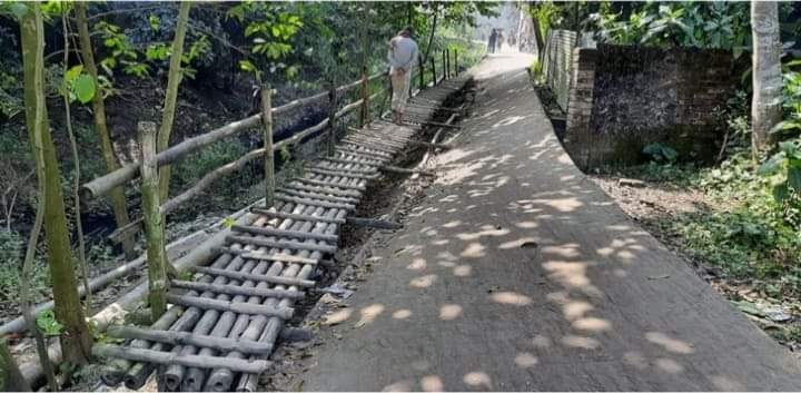 মানিকগঞ্জ শহরে পশ্চিম সেওতা এলাকায় পাকা সড়কের উপর বাশেঁর সাঁকো। মাত্র ২৫ মিটার রাস্তা ধসে পড়ার কারনে দূর্ভোগ পোহাচ্ছে এলাকাবাসী।