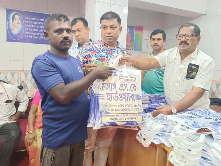 স্বর্গীয় কানাই লাল সাহার ছেলে দিলীর সাহার পক্ষ থেকে পূজার উপহার বিতরণ করা হয়।