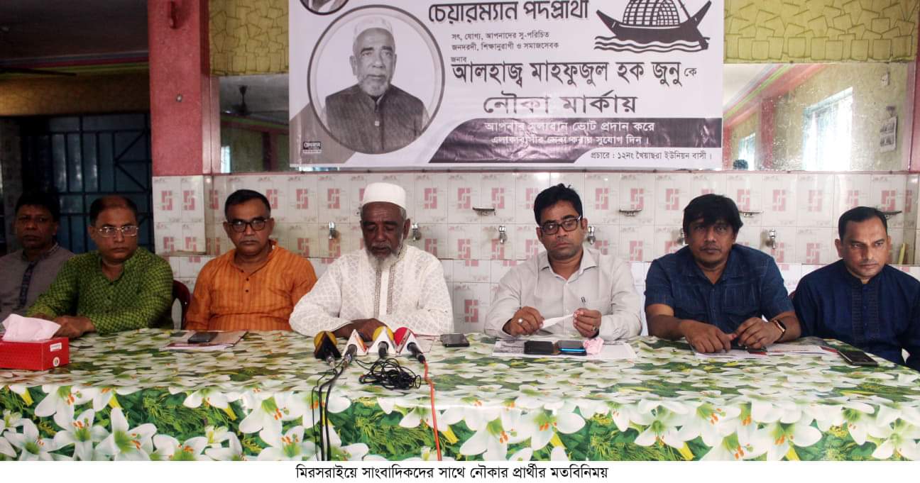 মীরসরাইয়ে আগামী ১১ নভেম্বর অনুষ্ঠিতব্য নির্বাচনকে ঘিরে উপজেলার ১২নং খৈইয়াছরা ইউনিয়ন পরিষদের আওয়ামী লীগের মনোনীত চেয়ারম্যান পদপ্রার্থী মাহফুজুল হক জুনু (নৌকা প্রতীক) সাংবাদিকদের সাথে মতবিনিময় করছেন। সোমবার (০৮ নভেম্বর) সকালে বড়তাকিয়া বাজারের আফরোজা গার্ডেনে এ মতবিনিময় করেন। এতে সভাপত্বিত করেন উপজেলা আওয়ামী লীগের সভাপতি জাহাঙ্গীর কবির চৌধুরী ও সাধারণ সম্পাদক একেম জাহাঙ্গীর ভূঁইয়া।