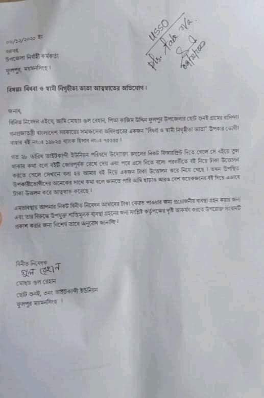 ময়মনসিংহের ফুলপুরের ভাইটকান্দি ইউনিয়নে বিধবা ও বয়স্ক ভাতা আত্মসাতের অভিযোগ উঠেছে।